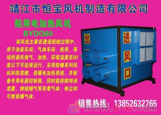 产品详情:船舶涂料热风机主要适用于大型工矿企业,采矿业,在建船舶的生产和建造,船舶涂料,煤气车间,船舶,集装箱,大型企业的通风,加热温度,出风口温度它可以在60-70度以下连续运转。船用涂层热风机使用防爆系列风扇防爆叶轮(铝合金材质制成),陶瓷加热系统,并配有专用的电气控制箱(包括泄漏,缺相,过载保护等)。安装),同时对船用涂层热风机的进风口和出风口开展加热。出口装有4个直径为250或300的风量调节阀,可同时向多个不同方向输送新鲜空气和热能。它可以敞开和关闭。进气口由铝合金制成,效率高。过滤器可防范异物进入网内。该风机具备风量大,气压高,送风相距长,加热快的特性。采用和保障安全准确。是受造船企业和大型企业欢迎的完美产品。船舶涂料用热风机的主要技术参数:1风量:15000m3/h,2风压:2000pa,3电机功率:11kw,4速度:2900r/min,5电压:380v,6加热器功率:96kw,7出风温度:70-80度.8送风相距为30-40米。
